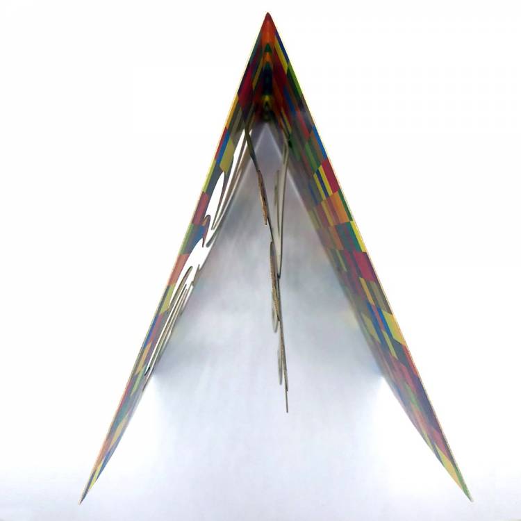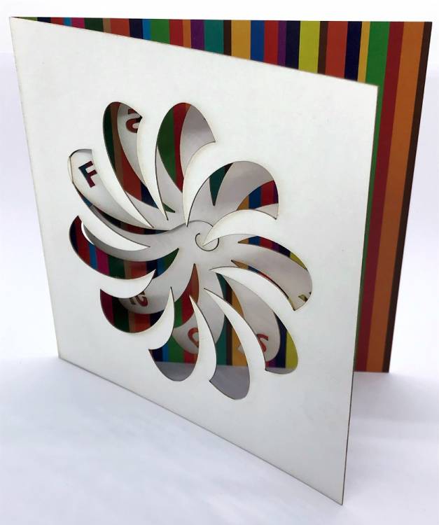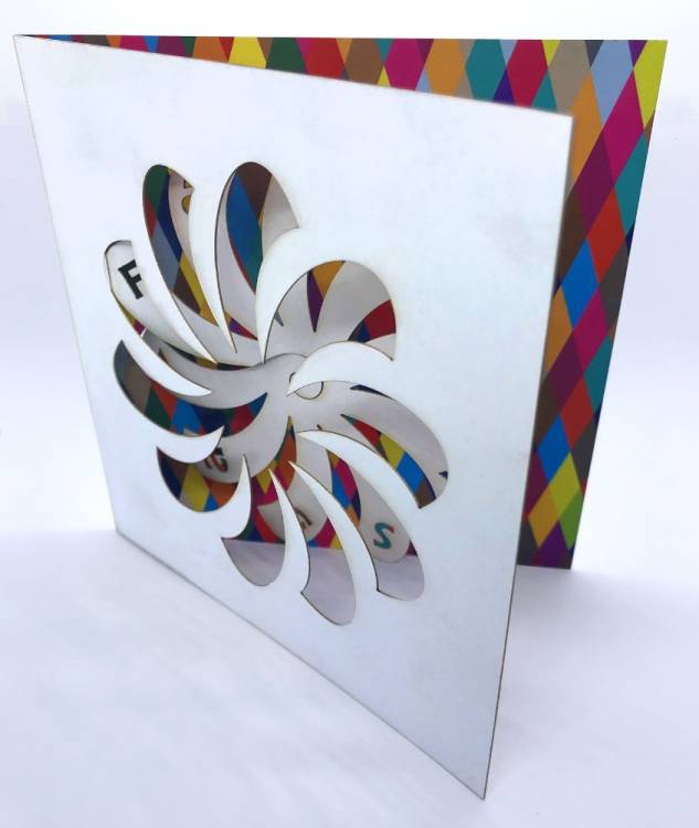 125mm (5") square white card with Propeller Spiral cut design showing multi-coloured pattern printed inside