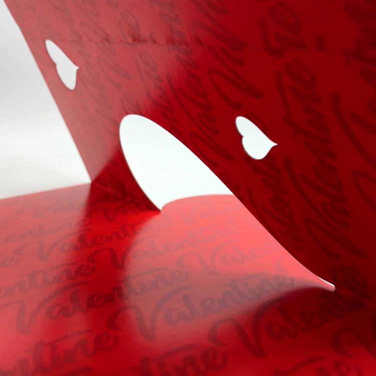 125mm (5") square white card with heart cut design showing red Valentine pattern printed inside.