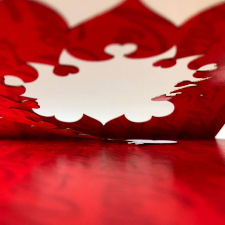 125mm (5") square white card with heart chain cut design showing red Valentine pattern printed inside.